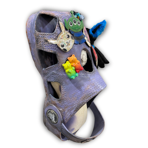 Her sculptures embody the tension between outward presentation and internal reality: the necessity of appearing capable, vibrant, and “together,” while privately carrying exhaustion, burnout, and quiet resilience. These forms reference both protective armor and theatrical costume, blurring the boundaries between concealment and self-expression, performance and authenticity.